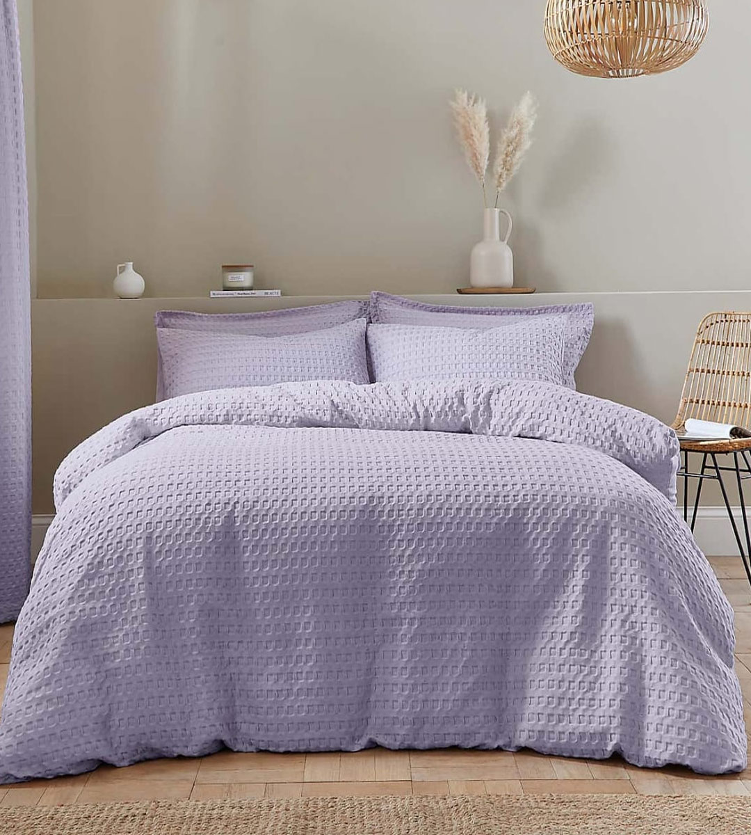 Add a modern touch to your bedroom with our elegant waffle design duvet cover set in a timeless lilac shade. Made from a soft and durable blend of 60% cotton and 40% recycled polyester, it offers breathable comfort for a cozy night’s sleep.