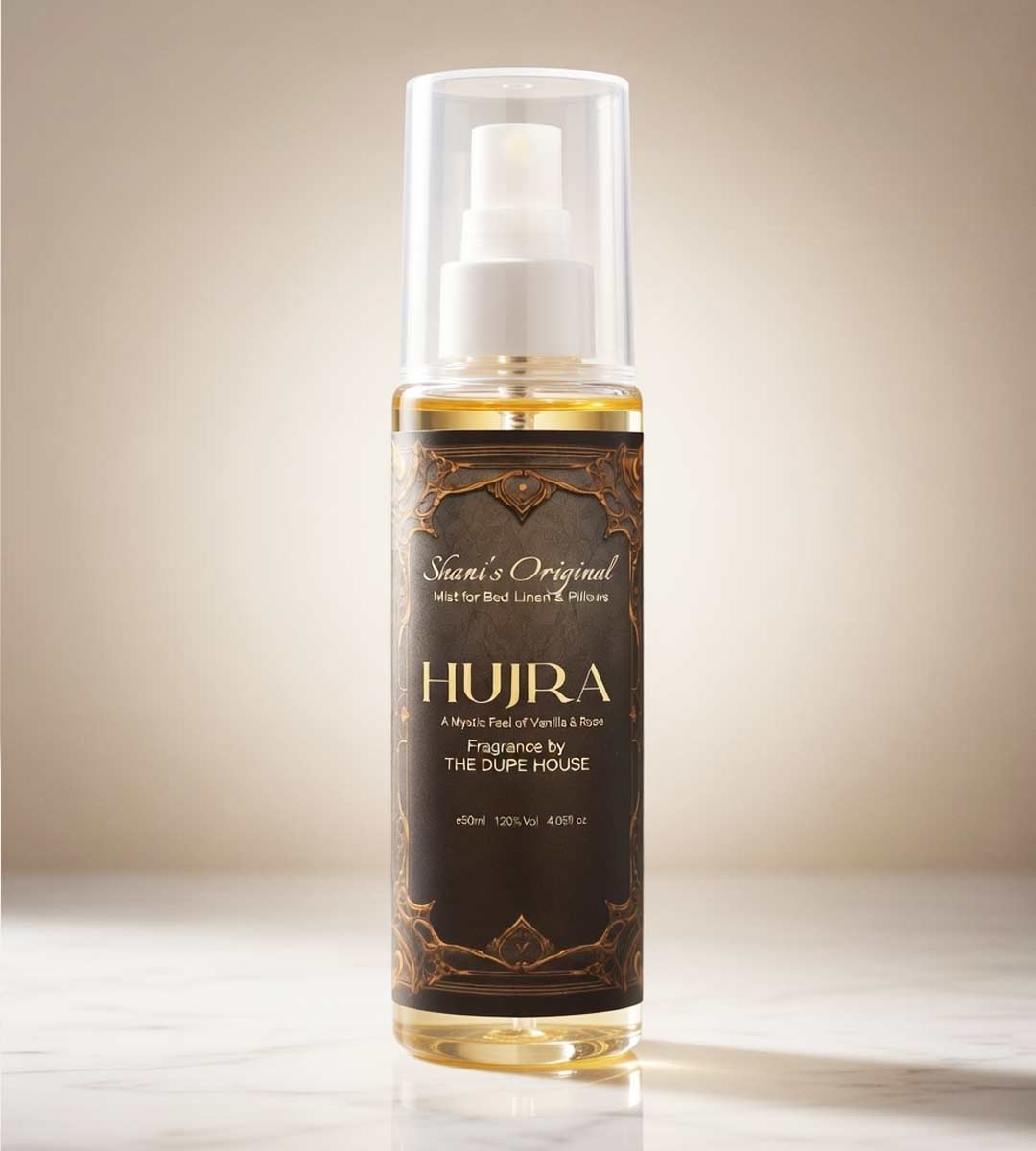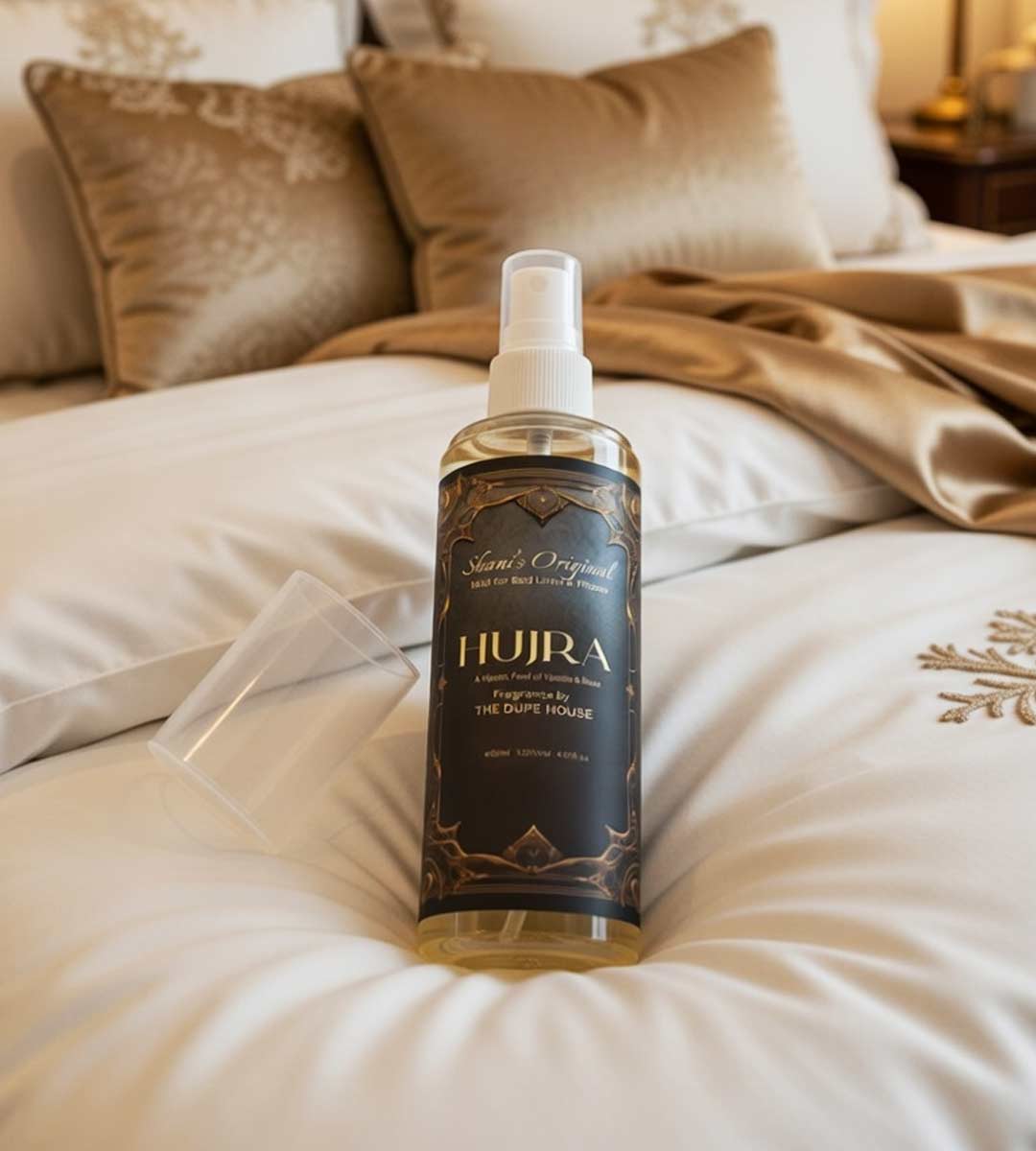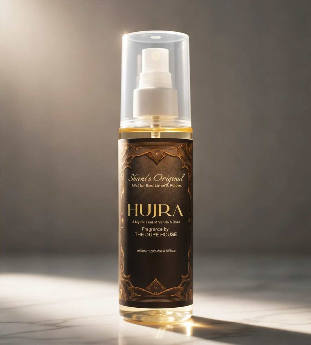 Experience tranquility with HUJRA, our new aromatic mist designed especially for your bed linen and pillows. This elegant blend opens with the rich, fruity notes of Cassis, followed by a heart of delicate May Rose and Freesia. The comforting base of Vanilla, Patchouli, Woody Notes, and Ambroxan creates a warm, soothing finish perfect for promoting an anxiety-free, restful sleep.