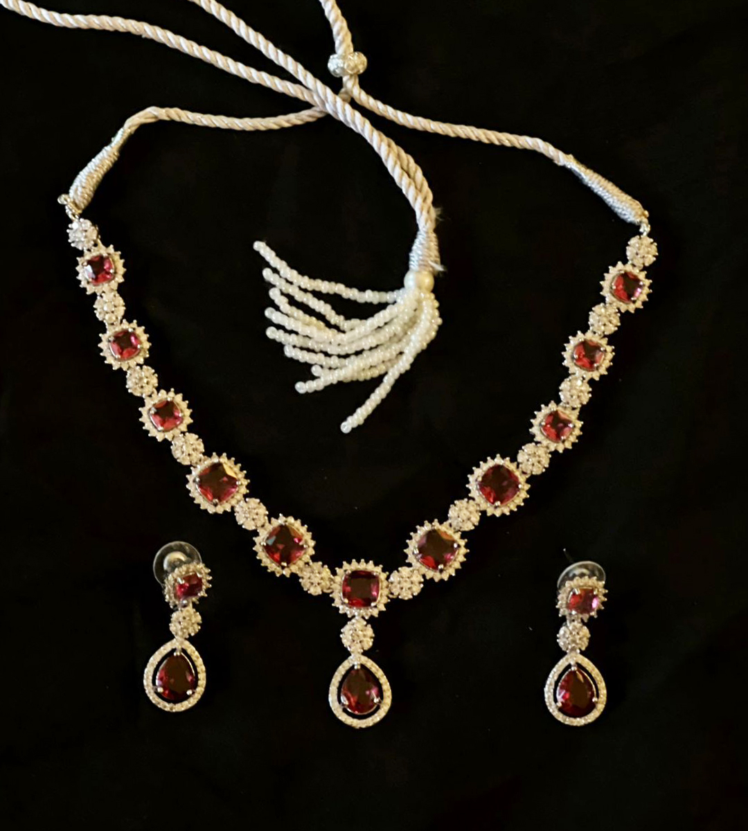 Beautiful ruby red stones surrounded by shiny white crystals make this necklace and earring set a must-have for any special occasion. The elegant design adds a classy touch to any outfit. The necklace comes with an adjustable pearl string for a perfect fit.